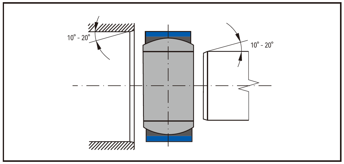A precise, centric positioning of the spherical bearingis the basic precondition for perfect installation. Accordingly, the housing bores and shaft ends should be chamfered 10° to 20° in axial direction.
